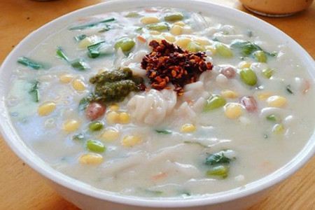 粉浆面条,既经济,又能够口,是河南人普遍喜食的一种风味小吃。它是将豆浆置于适当的温度下,发酵变酸,之后放入锅内加热到80度左右,液面便有一种蘑菇状的浆沫。此刻再加上少许的香油,循环往复搅拌,待滚沸,将面条下入,最好是杂面条。拌面糊使之呈糊状。再然后,将调制好的盐,葱花,青豆,芹菜,韭菜,辣椒再加入。洛阳浆面条,制造简单,成本低,味道美,易于消化,是具备浓厚地方特色的地方名食