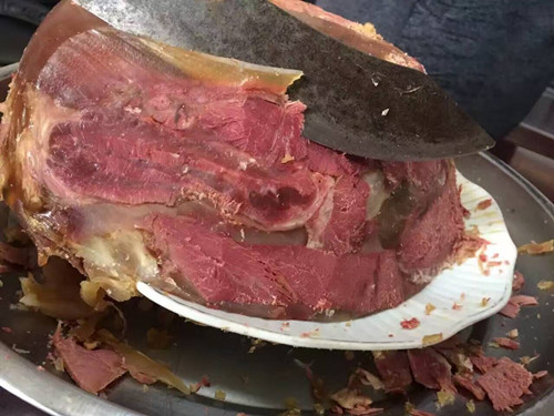 小车牛肉要选用上等的黄牛肉,将牛肉切成小块后在锅内煮烂,另一锅同时煮上牛蹄筋,一直把筋煮成浓汤,然后在容器内舀一勺汤,摆一层牛肉,撒上磨成粉的花椒大料,容器装满后,盖上盖子,十多分钟后,凝固的小车牛肉就算成功了。