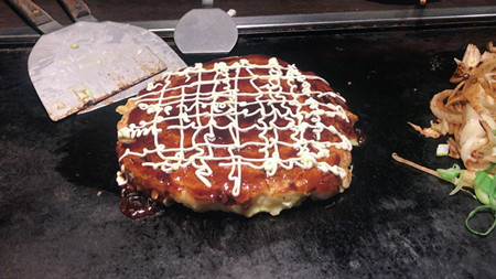 阪烧源自日本,是一种日式蔬菜煎饼。随着当下经济的发展,市场的步伐,大阪烧从日本流入中国,有些地区根据日文汉字的写法,直接叫着“御好烧”,御好烧的罗马拼音是"Okonomiyaki",在日文中,Okonomi大意是“喜欢什么就加什么”的意思,Yaki意指“煎”,Okonomiyaki意指“随意烧出你喜欢的食物”。除了主料卷心菜外,可以加任何肉类和海鲜进去。因为大阪烧本质上是很松散的蔬菜煎饼,用铁铲翻面时要格外潇洒,才能保持煎饼的完整性。坐在炙热的铁板前,看着厨师手中的铁铲行云流水般地上下飞舞,也给他们平添了几分帅气。
