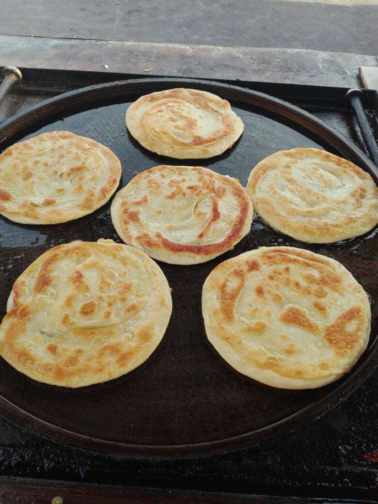 3.和发面饼不同的是,烙这种烫面饼多放一点油更好吃,当然也依个人口味添加辣酱,甜面酱,咸菜,生菜..!!