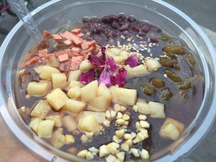 冰粉是手搓冰粉,里面的材料很丰富,有山楂、红豆、绿豆、醪糟、西瓜、小丸子、椰果、花生碎、芝麻、葡萄干、玫瑰花等11中配料,小丸子吃起来很软糯,夏天就是需要这么小清新的味道!一碗冰粉一个黏软细腻,一个爽滑清凉,加上花生碎、芝麻、山楂片、葡萄干、蔓越莓等配料,浓厚的糖汁一浇上去,透明的缝隙被缓缓填满,妖艳而华丽。